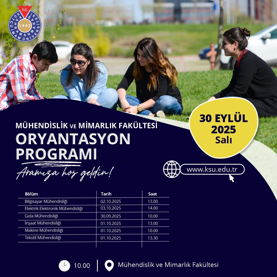 01.10.25 Çarşamba Saat 10.00' da Makine Mühendisliği Bölümü Teknik Resim Sınıfında oryantasyon programı düzenlenecektir. 1. sınıfların katılımı zorunlu olup program diğer sınıfların katılımına açıktır.